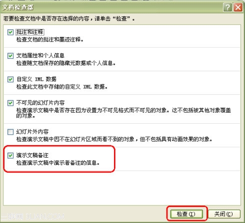 (2)選中“演示文檔備注”復選框,以檢查演示文檔中演示者備注的信息,然后單擊【檢查】按鈕。