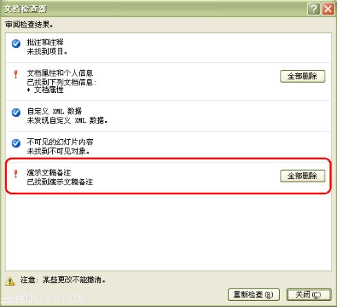 (3)在檢查結果中,文檔檢查器檢查到文檔中有演示文稿的備注,單擊右側的【全部刪除】按鈕即可刪除該演示文稿所有幻燈片的備注信息。
