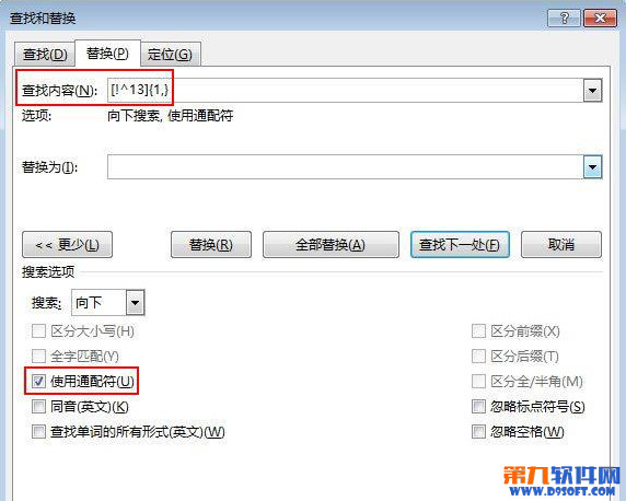 ②單擊更多按鈕之后,勾選使用通配符。在查找內容中輸入: [!^13]{1,}