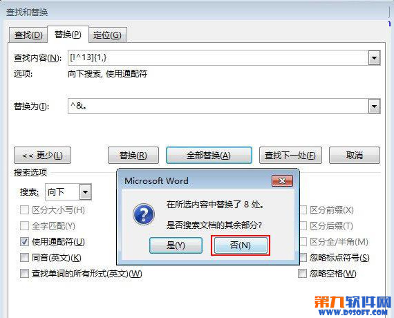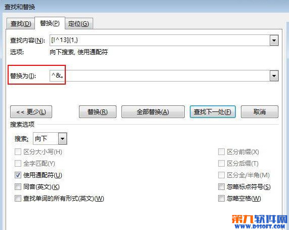①我們啟動Word2013,打開文檔,發現末尾處都沒有句號。按下鍵盤上的Ctrl+H,打開替換對話框。 ②單擊更多按鈕之后,勾選使用通配符。在查找內容中輸入: [!^13]{1,} ③在替換為里面輸入: ^&。 ④單擊全部替換按...