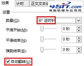 對于陀螺旋動畫,設(shè)置較小的角度(案例選擇了6度逆時針,因為矩形開始順時針旋轉(zhuǎn)了3度),并勾選”自動翻轉(zhuǎn)”,設(shè)置好重復(fù)的次數(shù).具體如下圖: