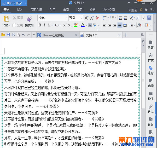 1、打開wps文字中的一篇原始文檔,用你鼠標選中需要添加雙波浪邊框的段落,然后把鼠標切換到功能區的“開始”選項,點擊“邊框”的圖標按鈕。