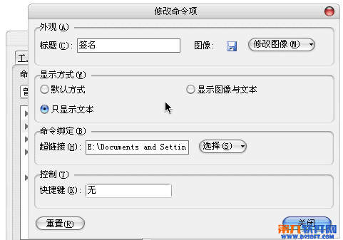 在自定義窗口的右側命令列表中雙擊剛添加的“保存”命令項打開“修改命令項”對話框。輸入標題為“簽名”,顯示方式則選中“只顯示文本”單選項。接著單擊命令綁定的“選擇”按鈕,在下拉列表中選擇“插入圖片”,在彈出對話框中選擇打開要插入的個人簽名的圖片文件。然后把輸入光標定位到快捷鍵的輸入框中按Delete鍵刪除原有快捷鍵,以免干擾原來的保存快捷鍵。當然在此你也可以自己指定另外一組新的快捷鍵。最后單擊關閉完成設置,再關閉退出自定義窗口。