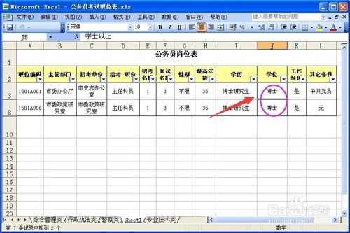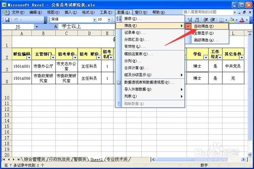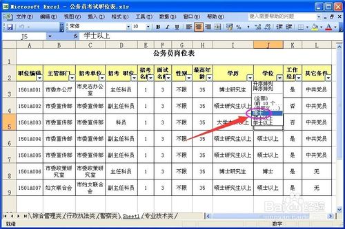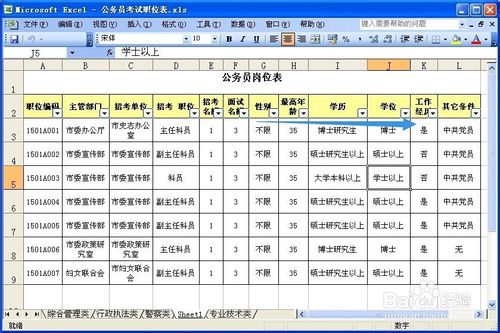例如:我們給“學(xué)位”設(shè)置條件為博士。這時,在工作表中就只顯示“博士”的數(shù)據(jù)列了。
