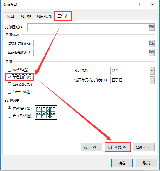 解決方法:【頁面布局】——【工作表】——【單色打印】——【打印預覽】