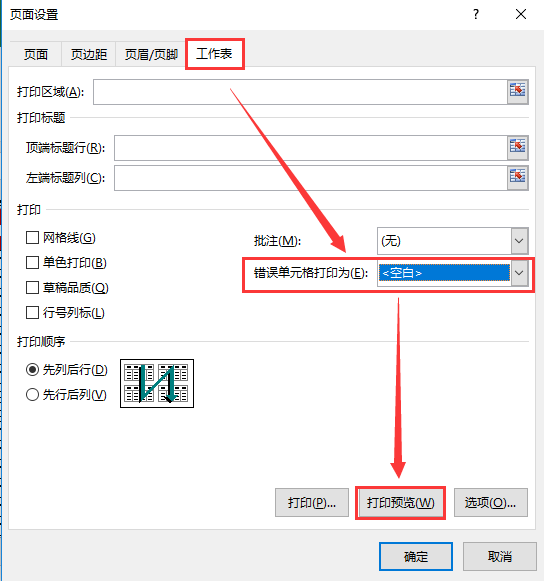 解決方法:選中錯誤值——【頁面布局】——【工作表】——【錯誤單元格打印為】——【空白】——【打印預覽】