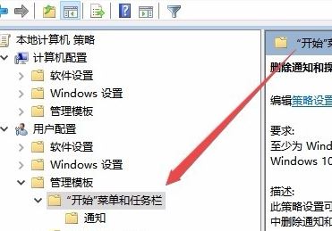 4.在打開的本地組策略編輯器窗口中,依次點擊“用戶配置/管理模板/開始菜單和任務欄”菜單項。