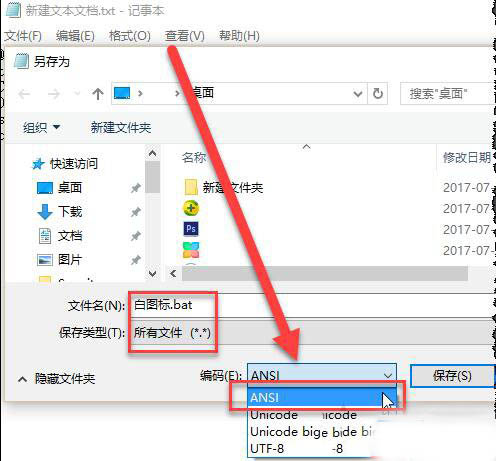 4、如果保存時候提示了含有Unicode字符時,我們點擊“取消”,然后再點擊“文件”,選擇“另存為”,編碼選項中選擇“ANSI”,再保存為.bat格式。