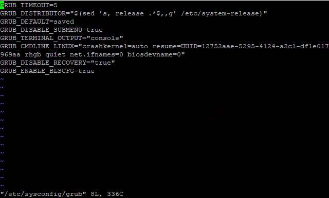在”GRUB_CMDLINE_LINUX“變量中添加一句”net.ifnames=0 biOSdevname=0“