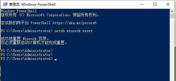 2、我們?cè)赪indows PowerShell窗口中輸入“netsh winsock reset”命令,并回車鍵確定,這時(shí)會(huì)提示成功地重置Winsock目錄,你必須重新啟動(dòng)計(jì)算機(jī)才能完成重置。