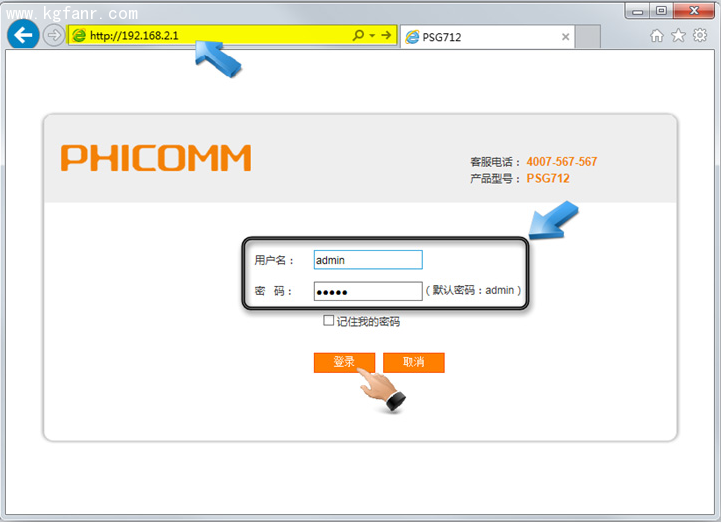 打開瀏覽器,在地址欄中輸入之前本地連接狀態信息里的默認網關地址(默認:192.168.2.1),出現路由器登陸界面,輸入默認登陸賬號和密碼均為“admin"。