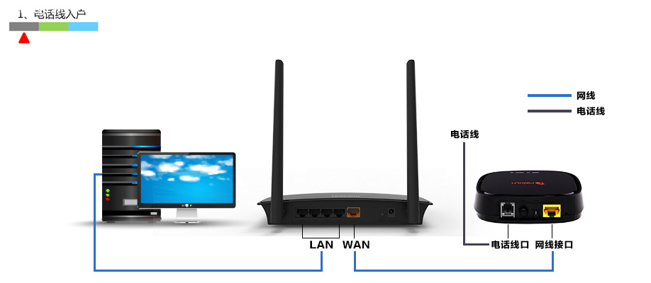 一、連接方法1、首先使用一根網線連接路由器的LAN與電腦的網口(如您電腦目前有網線連接著,請先拔出掉),連線如圖。2、接通斐訊路由器電源(除路由連接電腦的網線其余的網線暫時先不要接)3、接通路由...