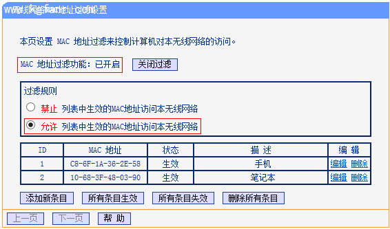 [2] 設(shè)置無線MAC地址過濾。如果使用網(wǎng)絡(luò)的終端基本固定,不會(huì)經(jīng)常有其他人接入無線網(wǎng)絡(luò),建議啟用無線MAC地址過濾,只允許所有家庭成員的設(shè)備接入。設(shè)置方法:登錄到路由器的管理界面,點(diǎn)擊 無線設(shè)置 >> 無線MAC地址過濾,把使用環(huán)境中的無線終端MAC地址都添加到允許列表,并啟用規(guī)則: