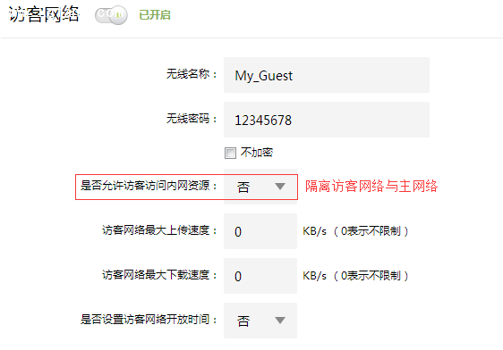 推薦使用訪客網(wǎng)絡(luò)功能,主網(wǎng)絡(luò)只對親友開放,對于一般的來訪者只需告訴他訪客網(wǎng)絡(luò)的無線名稱和密碼。請登錄到路由器的管理界面,點(diǎn)擊 高級(jí)設(shè)置 >> 無線設(shè)置 >> 訪客網(wǎng)絡(luò),開啟訪客網(wǎng)絡(luò),設(shè)置無線名稱與無線密碼,點(diǎn)擊保存,如下圖所示。