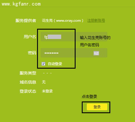 在用戶名密碼部分輸入申請到的花生殼賬號密碼,勾選 自動登錄,點擊 登錄。