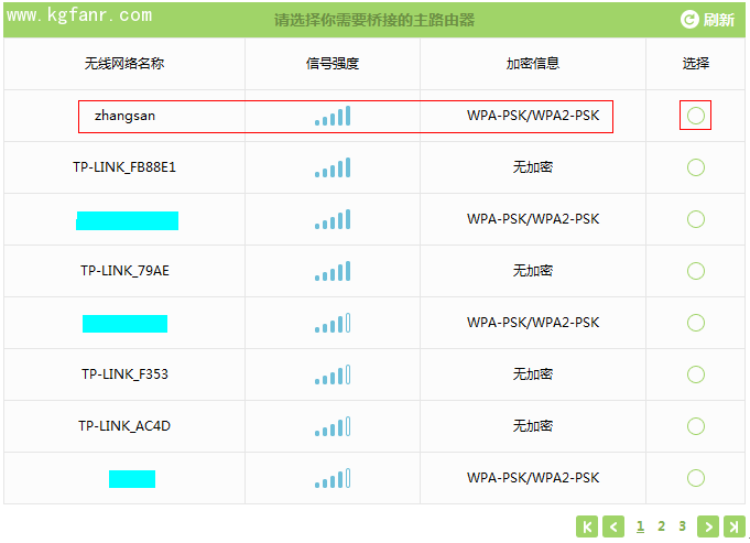 注意:信號列表可能不止一頁,可以點擊進入到下一頁。如果無法掃描到主路由器信號,請減小路由器之間的距離或障礙物。