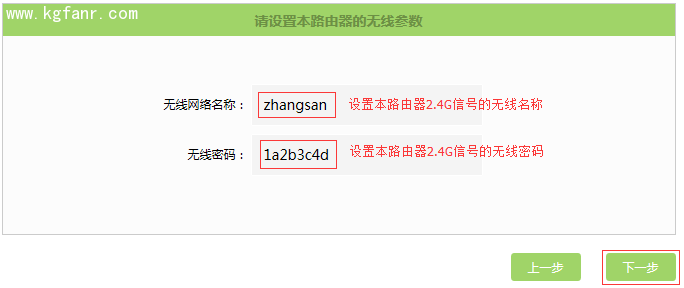 掃描并連接主路由器信號后,設置本路由器2.4G信號的無線網絡名稱和無線密碼,并點擊 下一步,如下: