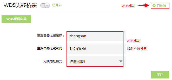 至此無線WDS橋接設置完成,副路由器下的無線終端連接到zhangsan,即可正常訪問網絡。終端移動過程中,可以實現主、副路由器間的自動漫游。