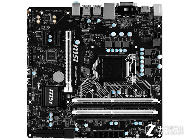 內(nèi)存支持方面,擁有4個(gè)DDR4DIMM插槽,可支持最大64GB的雙通道DDR42133MHz內(nèi)存;擴(kuò)展插槽方面,有1個(gè)PCI-E3.0x16插槽,以及2個(gè)PCI-Ex1插槽。SATA接口方面原生支持1個(gè)SATAExpress接口,可提供高達(dá)16Gb/s的帶寬,6個(gè)SATAIII接口也是誠(chéng)意滿滿,這一點(diǎn)是B150芯片組相比上代提升比較大的地方。