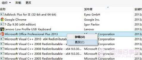 2.打開控制面板中的程序和功能項,進入卸載程序,找到Microsoft Office Professional Plus 2013然后右擊更改。