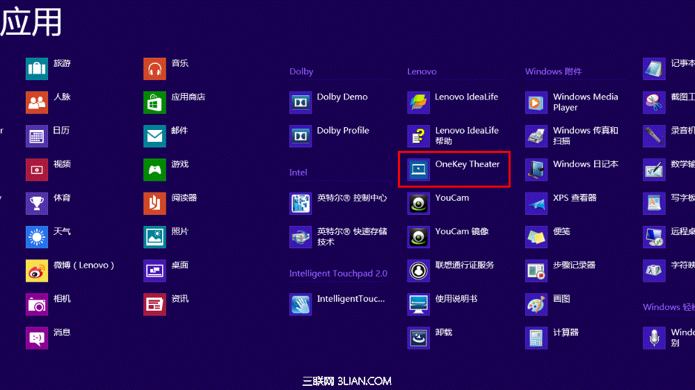 若上面的菜單中沒有,可以在“開始”菜單中點(diǎn)擊“鼠標(biāo)右鍵”顯示“所有應(yīng)用”點(diǎn)擊“OneKey Theater”
