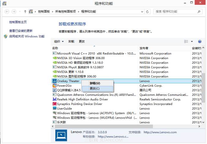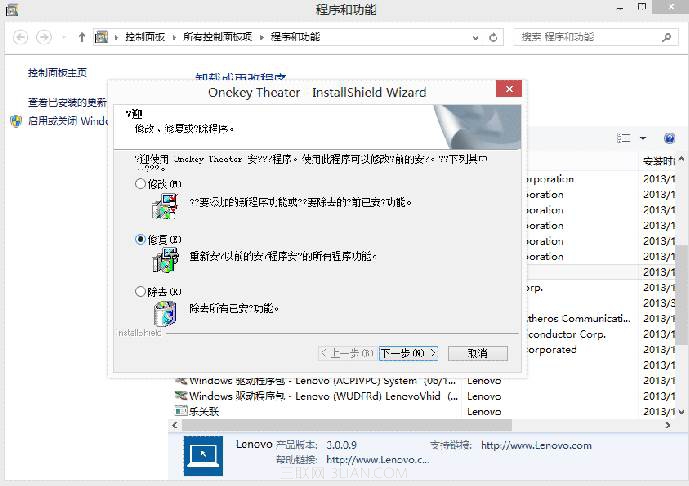 在Metro界面中找不到一鍵影音圖標(biāo),可在“控制面板”中“修復(fù)”“OneKey Theater”來解決,如下圖: