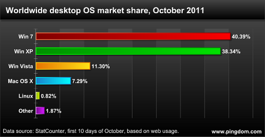 Windows 7的超越速度是飛快的,自2009年10月推出以來,在三個月的時間內,使用量超過Mac OS X,10個月內超過Windows Vista,而在兩年后的今天終于超越了Windows XP。