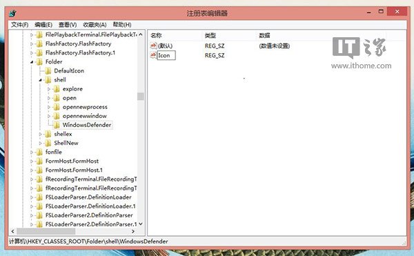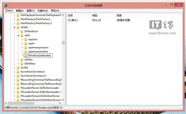 2、打開注冊表編輯器,定位至“HKEY_CLASSES_ROOTFolderShell”路徑,右鍵點擊Shell,選擇“新建-項”,項:“WindowsDefender”。