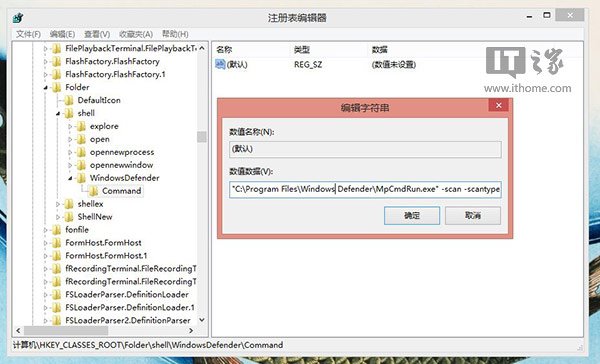 7、然后“Command”項右側雙擊編輯“默認”字符串值,輸入數值數據"C:Program FilesWindows DefenderMpCmdRun.exe" -scan -scantype 3 -SignatureUpdate -file %1