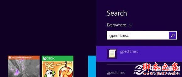 1、進入Win8.1開始屏幕,在搜索的地方,輸入gpedit.msc開啟本地組策略編輯器,如下圖: