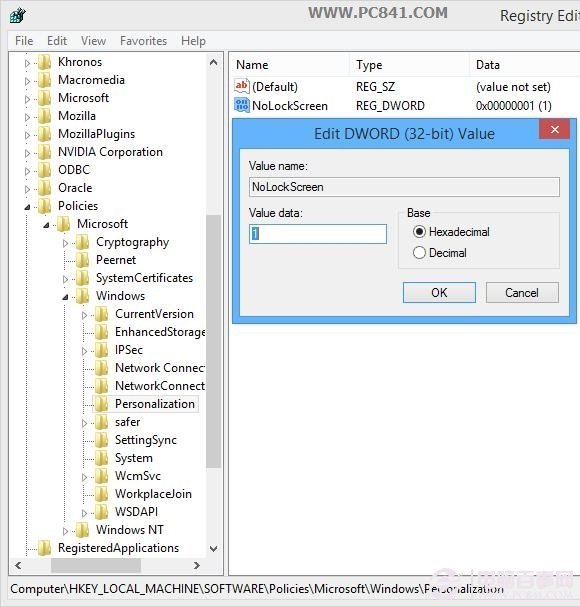第三步、最后右鍵點(diǎn)擊Windows文件夾,選擇“新建”-“項(xiàng)”(Key),命名為Personalization,選定。選擇Personalization條目后,在窗口右側(cè)右鍵點(diǎn)擊,創(chuàng)建一個(gè)新的Dword (32-bit value)(PC841.COM教程)注冊(cè)表?xiàng)l目,然后命名為NoLockScreen,雙擊該條目,然后將其值從0更改為1即可。