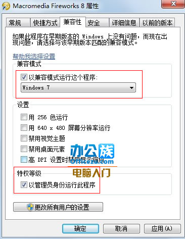 4、先勾選以兼容模式運(yùn)行這個(gè)程序,然后選擇Windows7,在特權(quán)等級(jí)里面勾選以管理員身份運(yùn)行此程序。