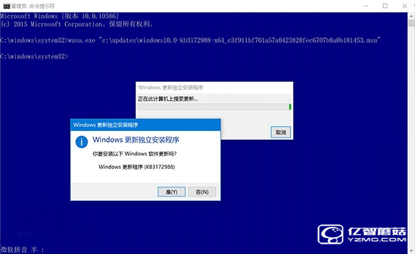wusa.exe "X:/路徑/windows10.0-kb3172988-x64_c3f911bf701a57a0423828fec6707b8a0b181453.msu" /quiet /norestart