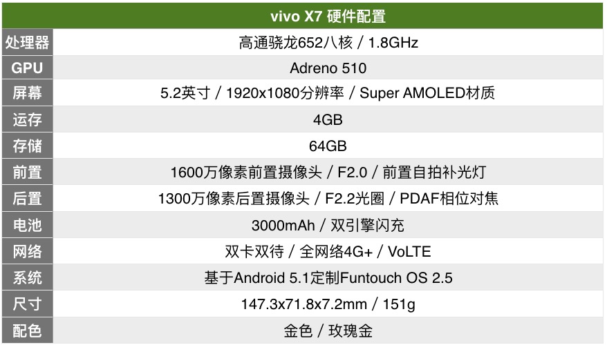 硬件配置方面,vivoX7采用一塊5.2英寸1080P分辨率SuperAMOLED顯示屏,內部配備高通驍龍652八核64位處理器,輔以4GBRAM+64GBROM。相機采用前置1600萬像素+后置1300萬像素組合(vivoX7Plus為前后雙1600萬像素攝像頭),其中前置攝像頭配有Moonlight自拍補光燈、內部配備3000mAh電池,支持vivo獨家雙引擎閃充技術以及雙卡雙待全網通4G+/VoLTE網絡制式。
