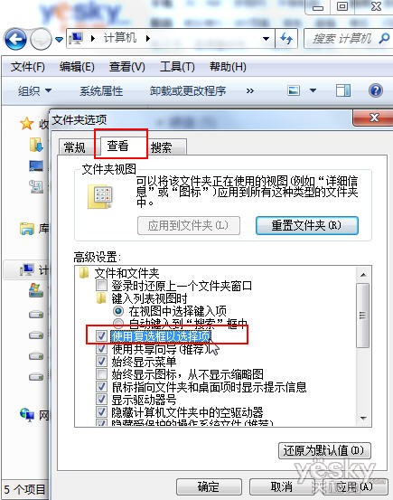 在“文件夾選項(xiàng)”設(shè)置面板中選擇“查看”選項(xiàng)卡, 勾選“使用復(fù)選框以選擇項(xiàng)”,按下“確定”按鈕。