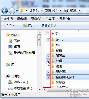 現(xiàn)在,資源管理器的“名稱”左邊出現(xiàn)了一個(gè)方形的勾選框,點(diǎn)擊這個(gè)勾選框可以輕松全選。