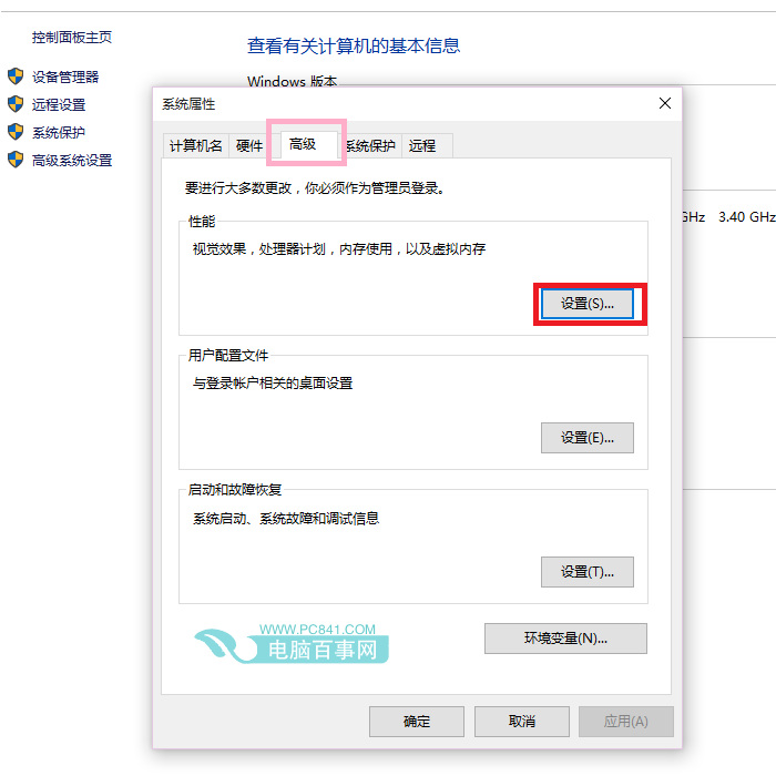 右鍵Win10系統桌面上的這臺電腦,選擇彈出菜單的屬性。如下圖所示。點擊打開屬性窗口,點擊左側的高級系統設置,如下圖所示。點擊進入系統屬性的高級選項卡,點擊性能下方的設置。打開的窗口可以設置性能視覺效...