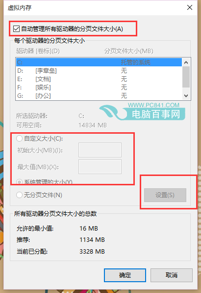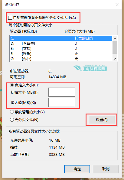 在虛擬內存對話框下面的可用空間設置初始大小和最大值,然后先點擊設置,在點擊確定。如下圖所示。