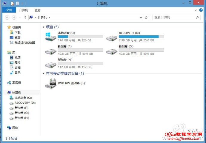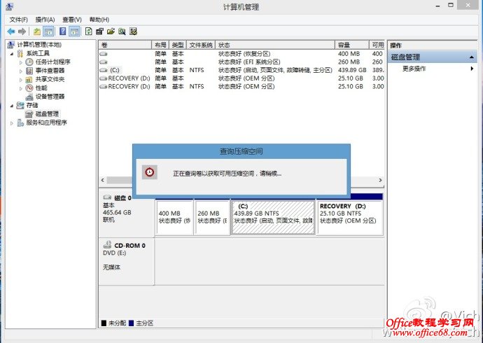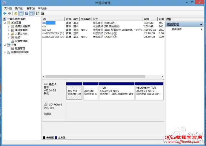 首先來看預裝window8系統的磁盤分區,一般是一個系統盤和一個系統恢復盤。我們需要把C盤減小,然后騰出空間做為其他分區。