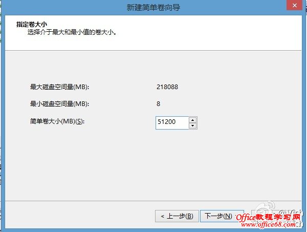 在未分配磁盤空間上,右擊操作,選擇“新建簡單卷”,按照向導提示進行分區。(圖中為示范建立一個50G=51200M的分區)
