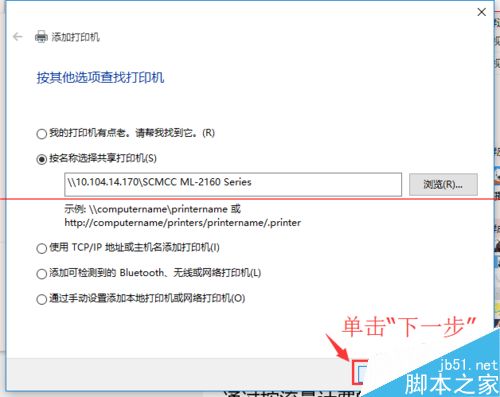3、這個時候點擊“我需要的打印機不在列表中”它,在彈出的新窗口中,可以看到5個單按鈕。我們選擇第二項“按名稱選擇共享打印機”,并點擊“瀏覽”。不選擇第三項,是因為第三項成功率不高。