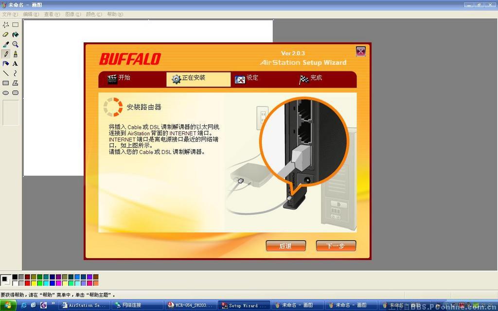 事先將已辦理寬帶業務的電話線插入調制解調器的電話線插孔,然后用一根網線將調制解調器(貓)的以太網口與BUFFLAO無線路由的以太網口連接,再將調整解調器插上電。