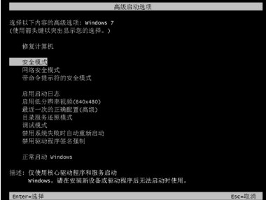 1、在出現(xiàn)上述界面時,按住電源開關10秒強制關機,確認關機后,再次點擊開關鍵開機,并連續(xù)點擊鍵盤上的F8鍵,直到出現(xiàn)高級啟動菜單(如下圖)。用鍵盤右下角的方向鍵“↓”鍵選擇“安全模式”按“回車”。
