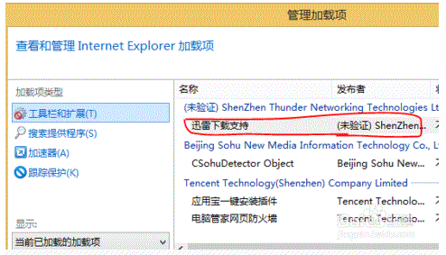 4. 在“管理加載項”界面下的“工具和擴展”選項下的“迅雷下載支持”列表里點擊鼠標右鍵,選擇“啟用”。