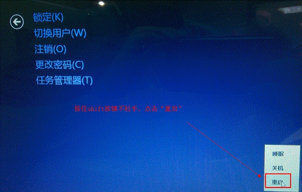 2. 按住鍵盤(pán)Shift按鍵不要松手,鼠標(biāo)點(diǎn)擊“重啟”快速進(jìn)入修復(fù)界面;