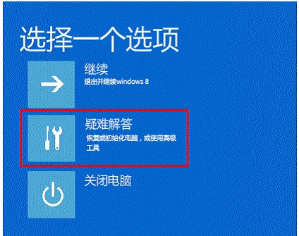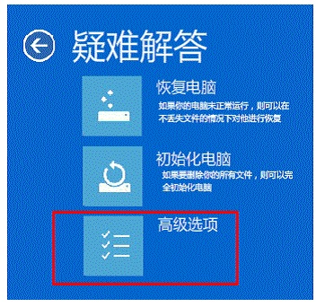 3. 將看到恢復(fù)界面,選擇“高級(jí)回復(fù)選項(xiàng)”---“疑難解答”;