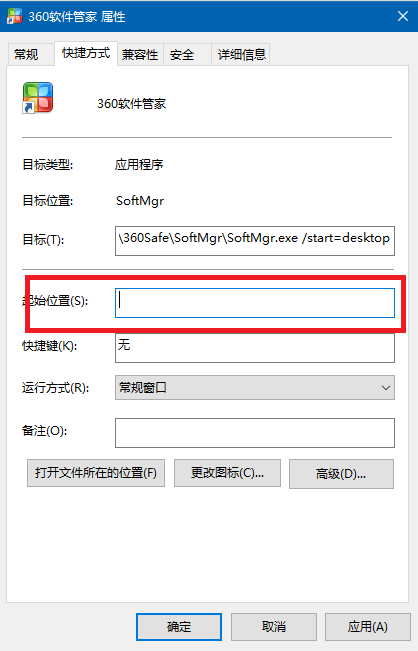 3、在屬性對話框中的“目標”及“起始位置”里的路徑還是老的,里面有個文件名被改掉了。找到被改掉的那個文件名改成現在的,點擊確定即可。