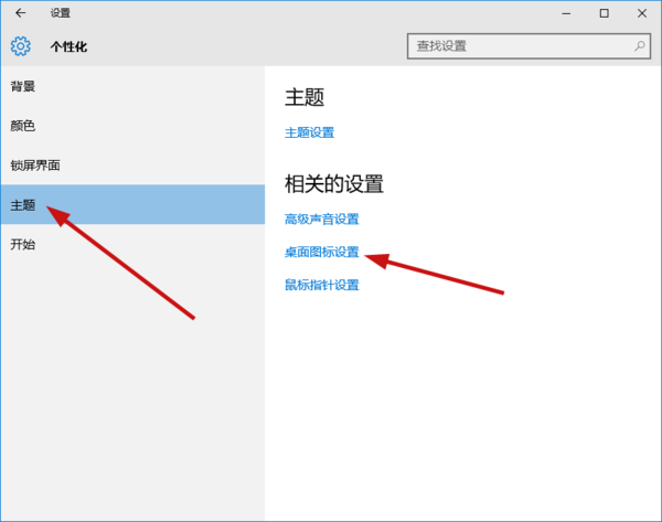 3、在個(gè)性化導(dǎo)航左側(cè)中,點(diǎn)擊主題,個(gè)性化設(shè)置右側(cè)可看到“桌面圖標(biāo)設(shè)置”,點(diǎn)擊即可;