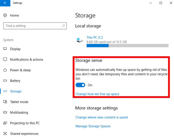用戶可以在“設置--系統--存儲”下找到Storage Sense功能的開關。