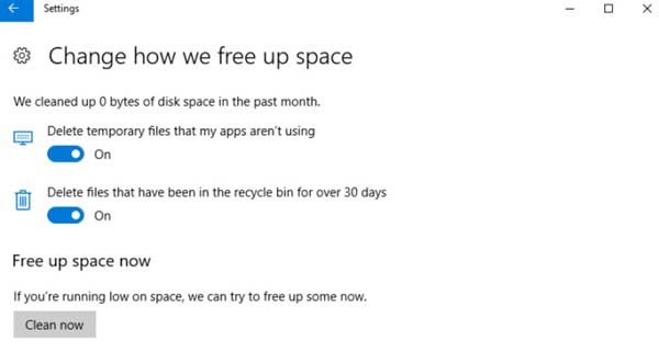 開啟后用戶還需要進一步的設置,總共也就兩個功能,第一個選項是允許系統30天自動清空回收站,而第二個選項的具體意義不明,但猜測應該是能夠自動清除C:/Temp文件夾下的臨時文件。